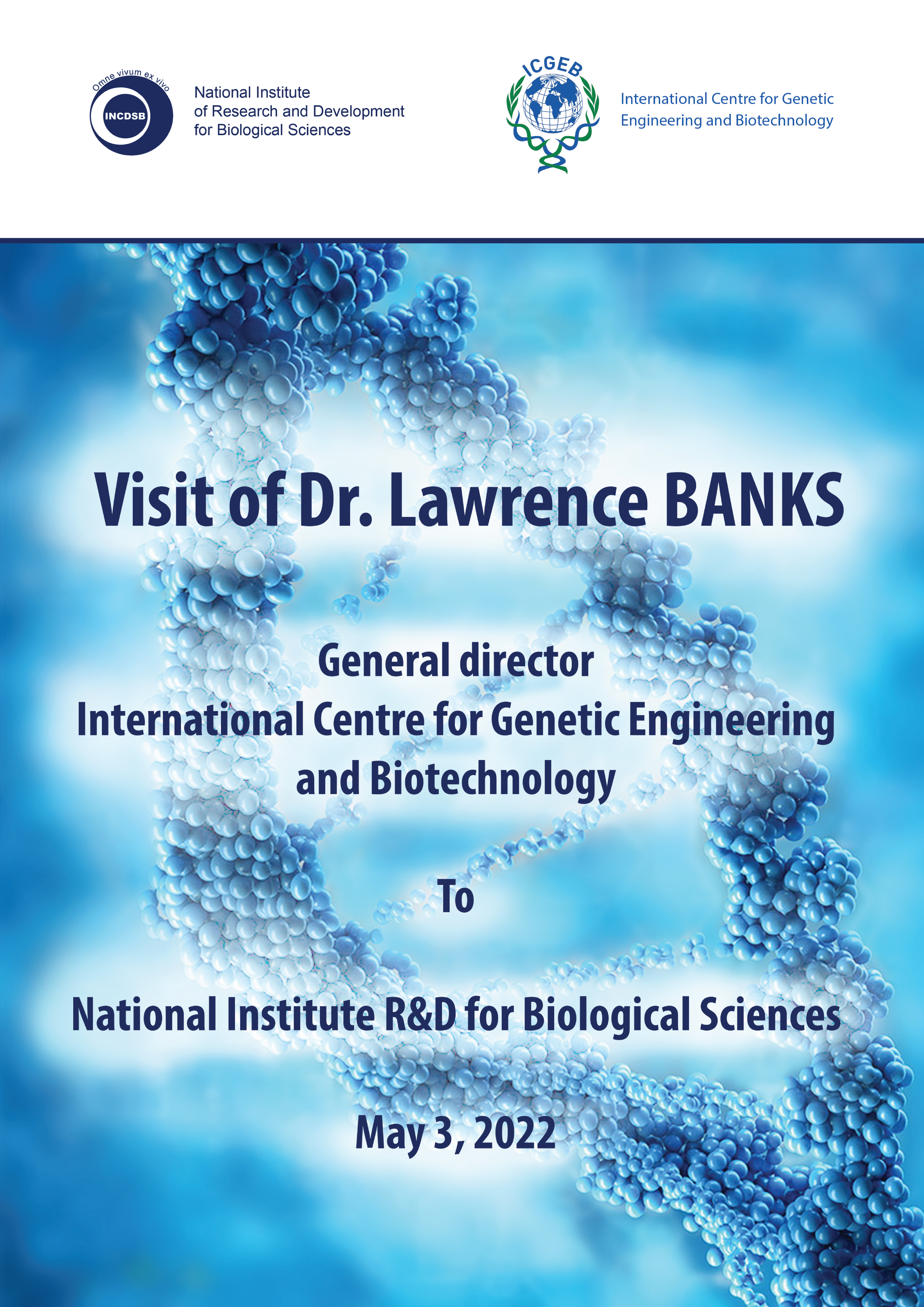 În perioada 3-5 mai 2022 va avea loc vizita Directorului General a Centrului Internațional de Inginerie Genetică și Biotehnologie, Dr. Lawrence BANKS însoțit de Dna Marianna MACULAN, șefa departamentului de Relații Externe ICGEB.